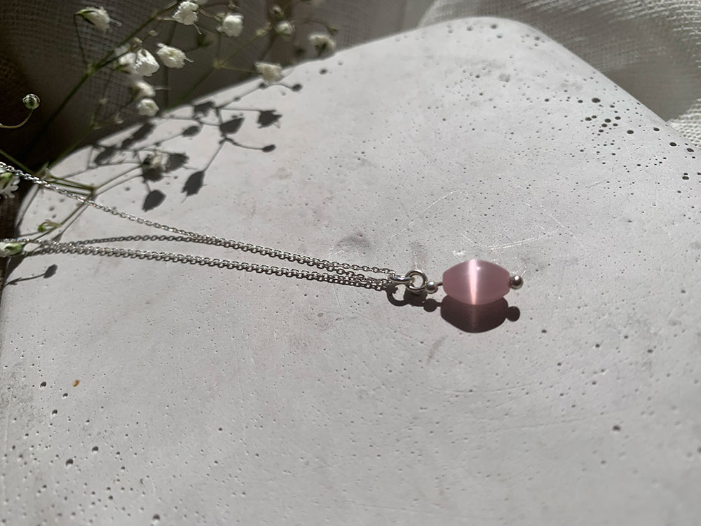 Κολιέ με ημιπολύτιμους λίθους – Ροζ Μάτι Γάτας. 40 cm αλυσίδα ασήμι 925, 4 cm επέκταση με ασήμι 925 και κούμπωμα ασήμι 925